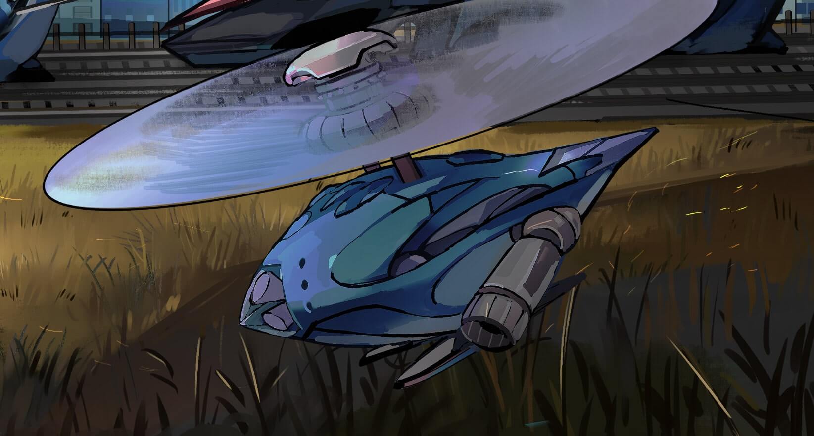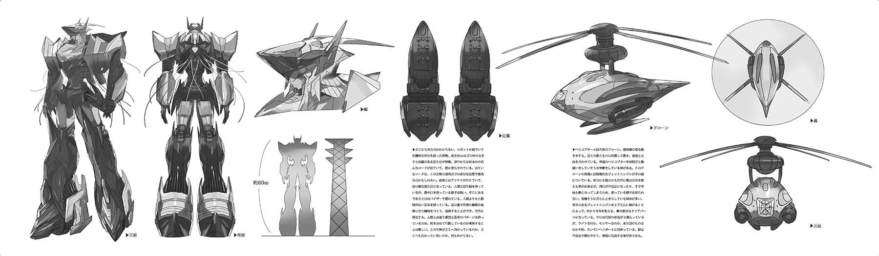 線路に沿って走行する無機物のキャラクターとドローンをデザインし描きました。