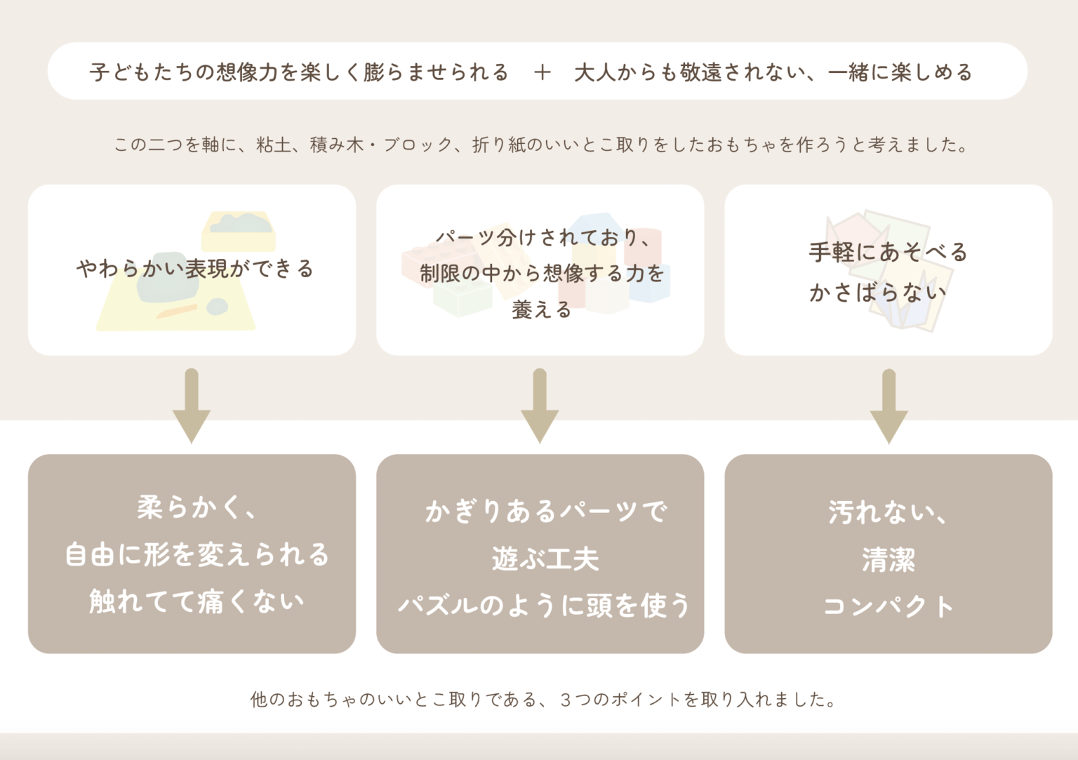 この問題を解決するにあたり、私は粘土や積み木、ブロック、折り紙など室内で遊べる発想力が身につくおもちゃに着目しました。