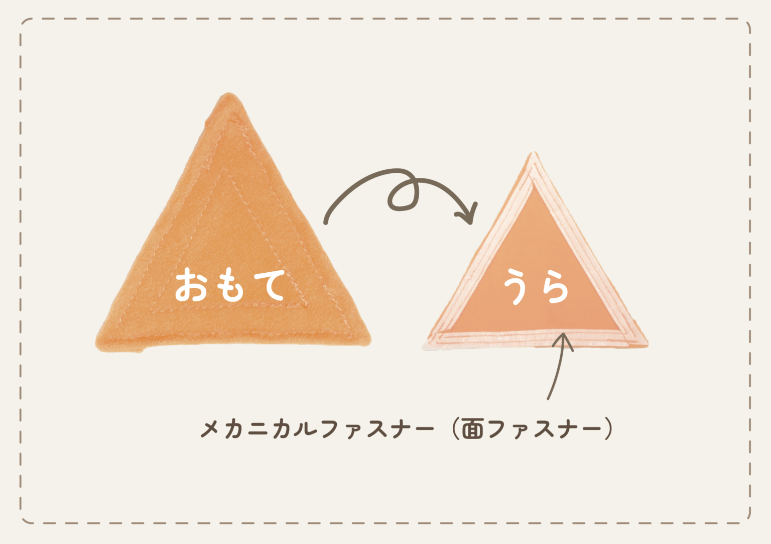 布でできたパーツの裏の端っこにメカニカルファスナー(痛くない面ファスナー)がついており、また布自体が面ファスナーがくっつくようにできているため、パーツとパーツ同士をくっつけることができます。