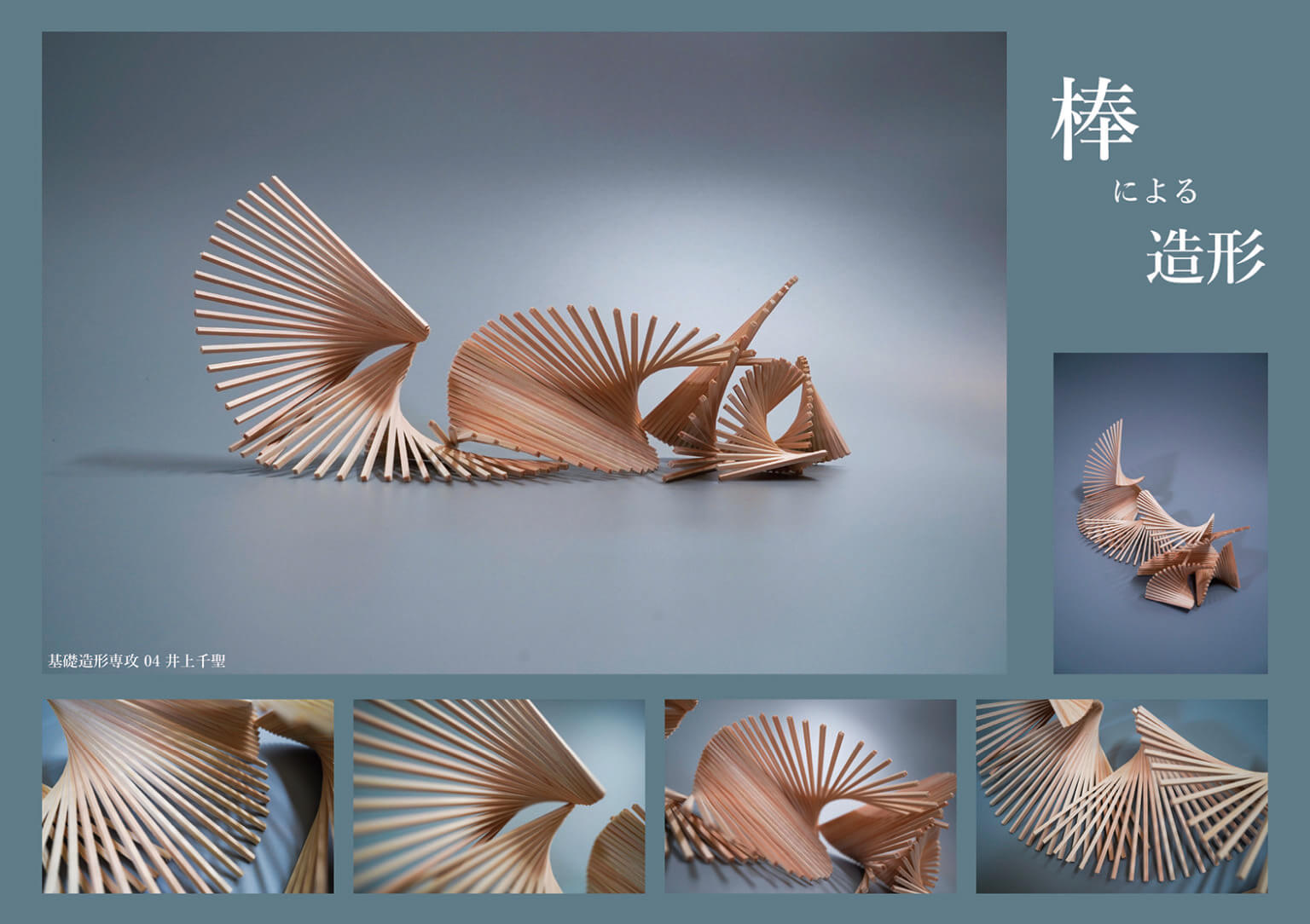 線材の特徴は〈長さ〉と〈方向性〉です。それを計画的に連続・集積させることで、生み出されるリズム感や動きなどの表現効果を学びます。形を〈体系的〉に理解して〈計画的〉に操作する「構成力」を養います。