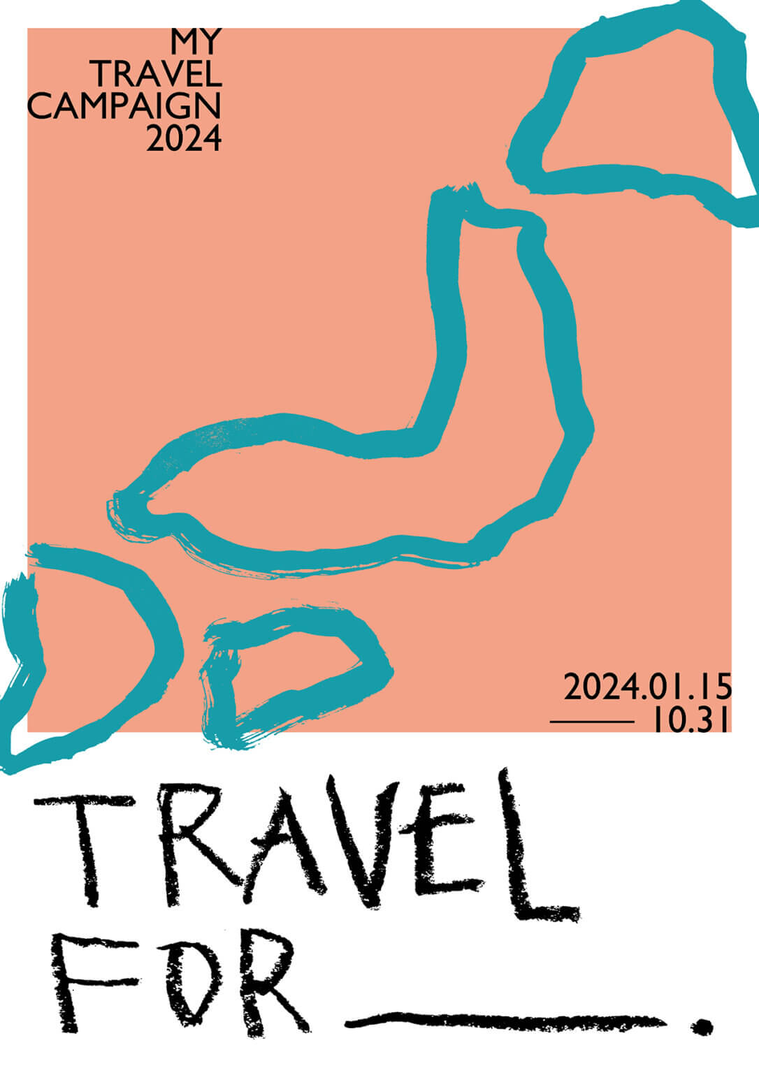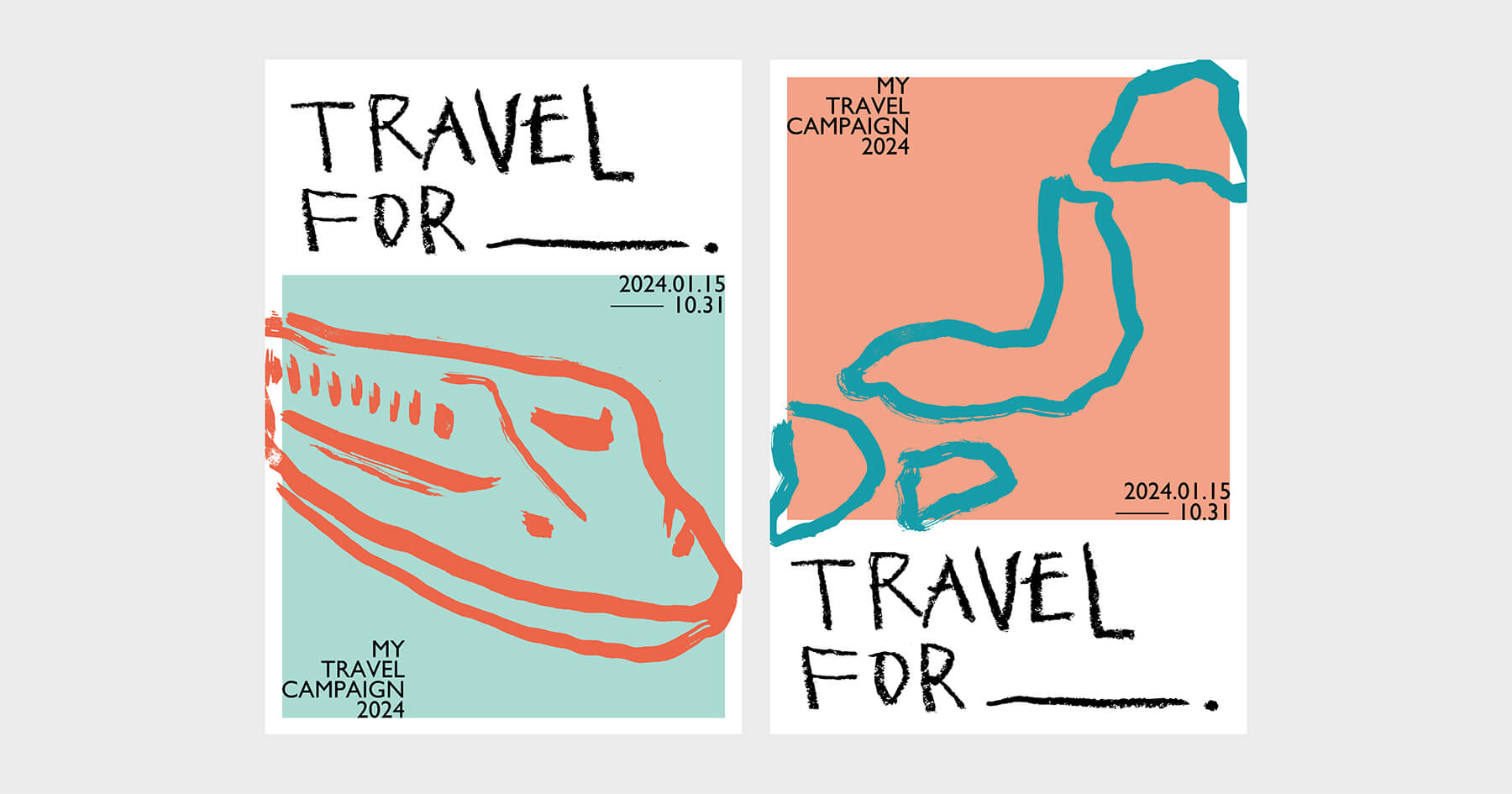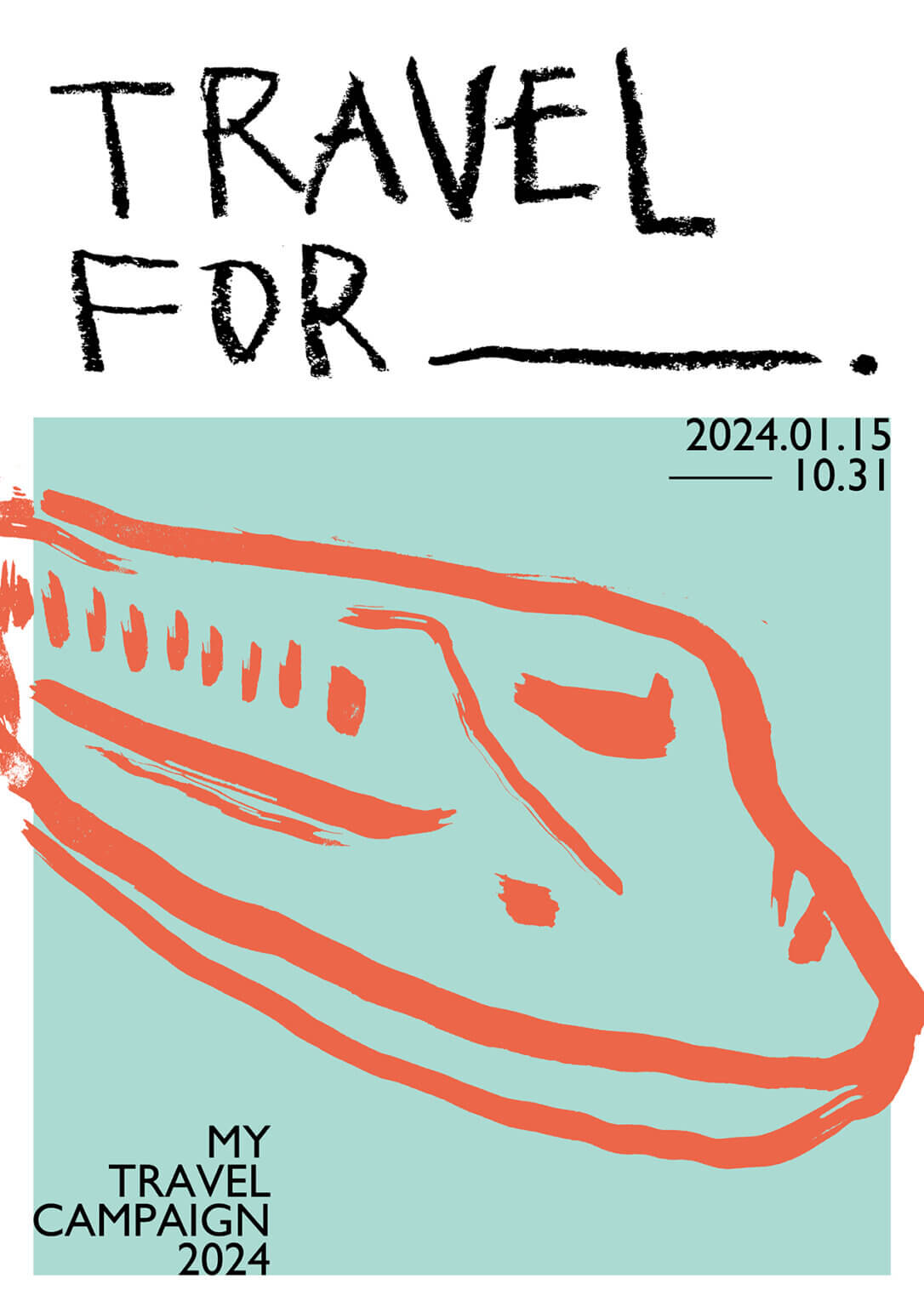 旅行のキャンペーンを想定した2枚組のポスターを制作した。モチーフは観光地を特定せず、日本地図と新幹線にすることで、旅行に漠然と行きたくなるようなビジュアルを目指した。travel for ____. という文字は、旅行の目的を想像が膨らむように促す効果を期待している。ダイナミックで素朴なテイストの絵をアイキャッチにした。