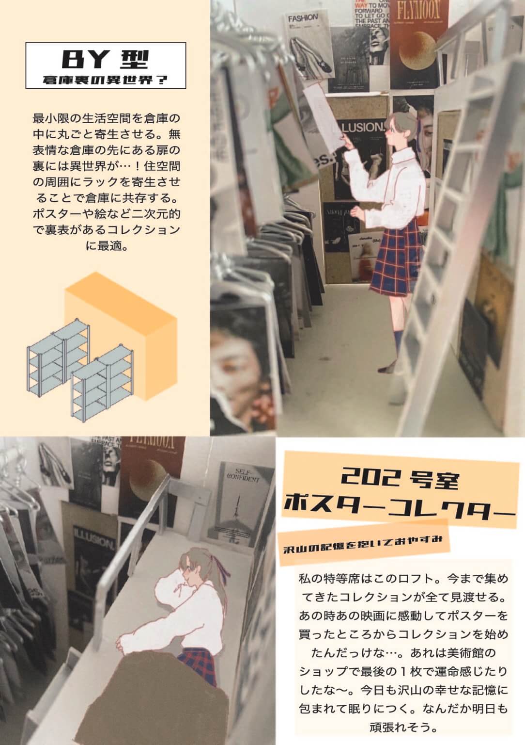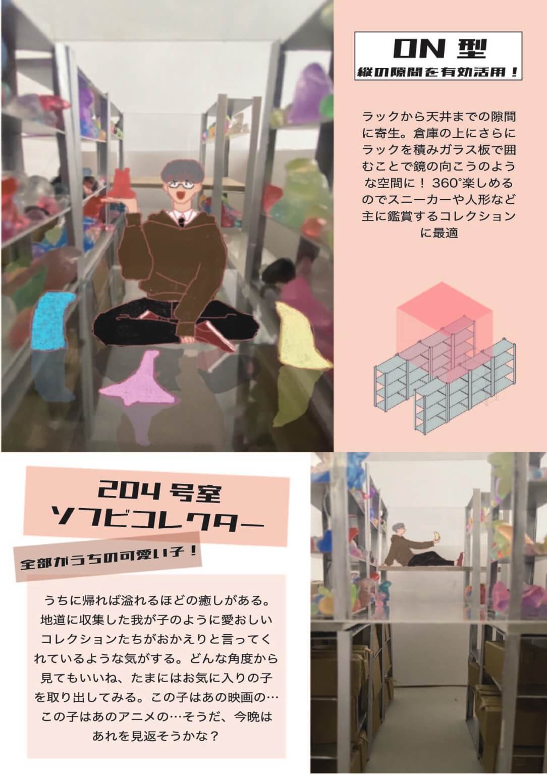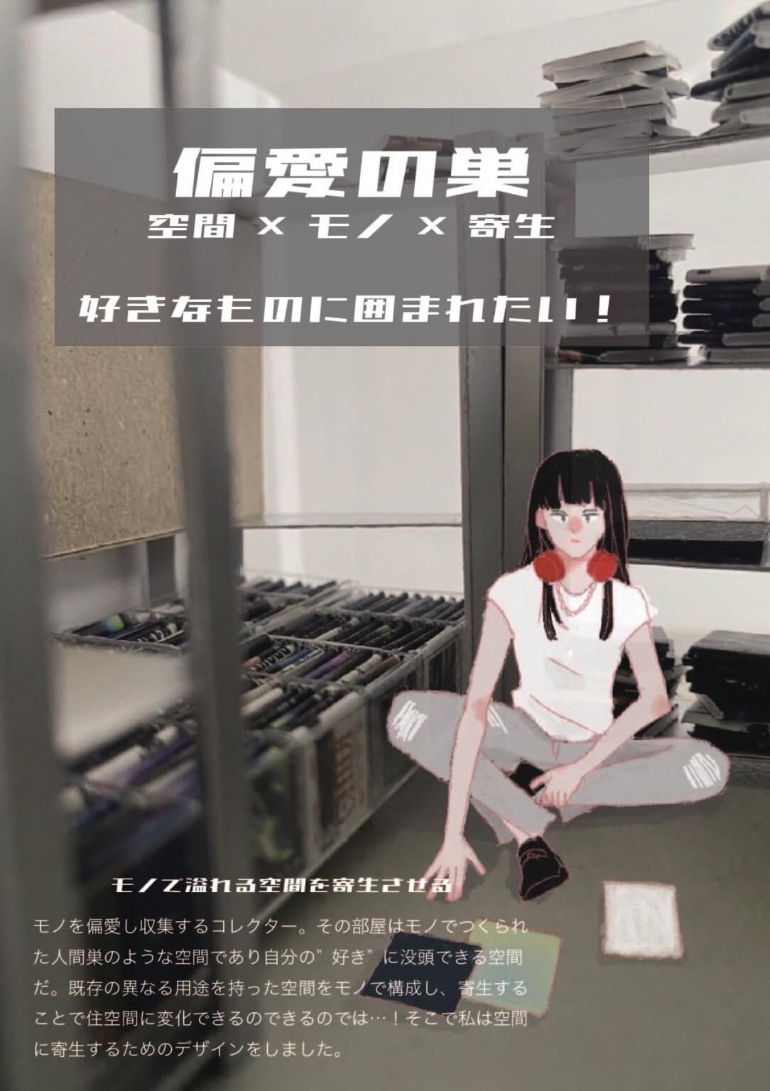 モノを偏愛し収集するコレクター。その部屋はモノでつくられた人間巣のような空間であり自分の” 好き” に没頭できる空間。既存の異なる用途を持った空間をモノで構成し、寄生することで住空間に変化できるのできるのでは…!そこで私は空間に寄生するためのデザインをしました。