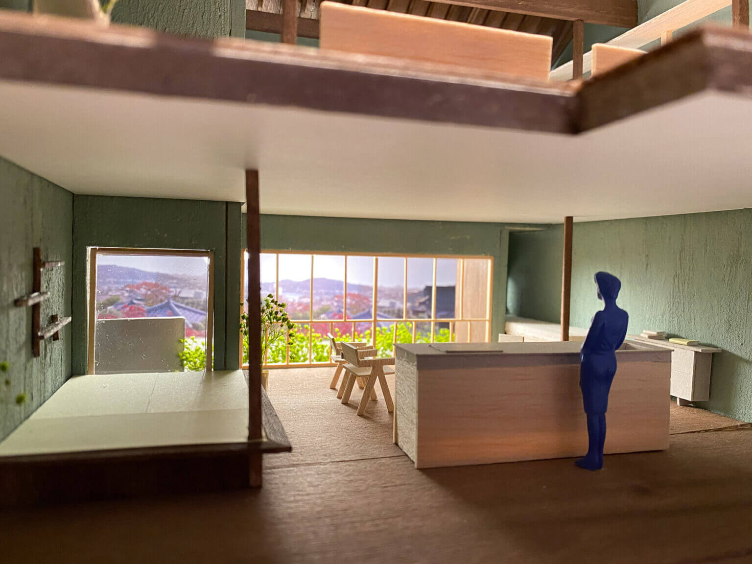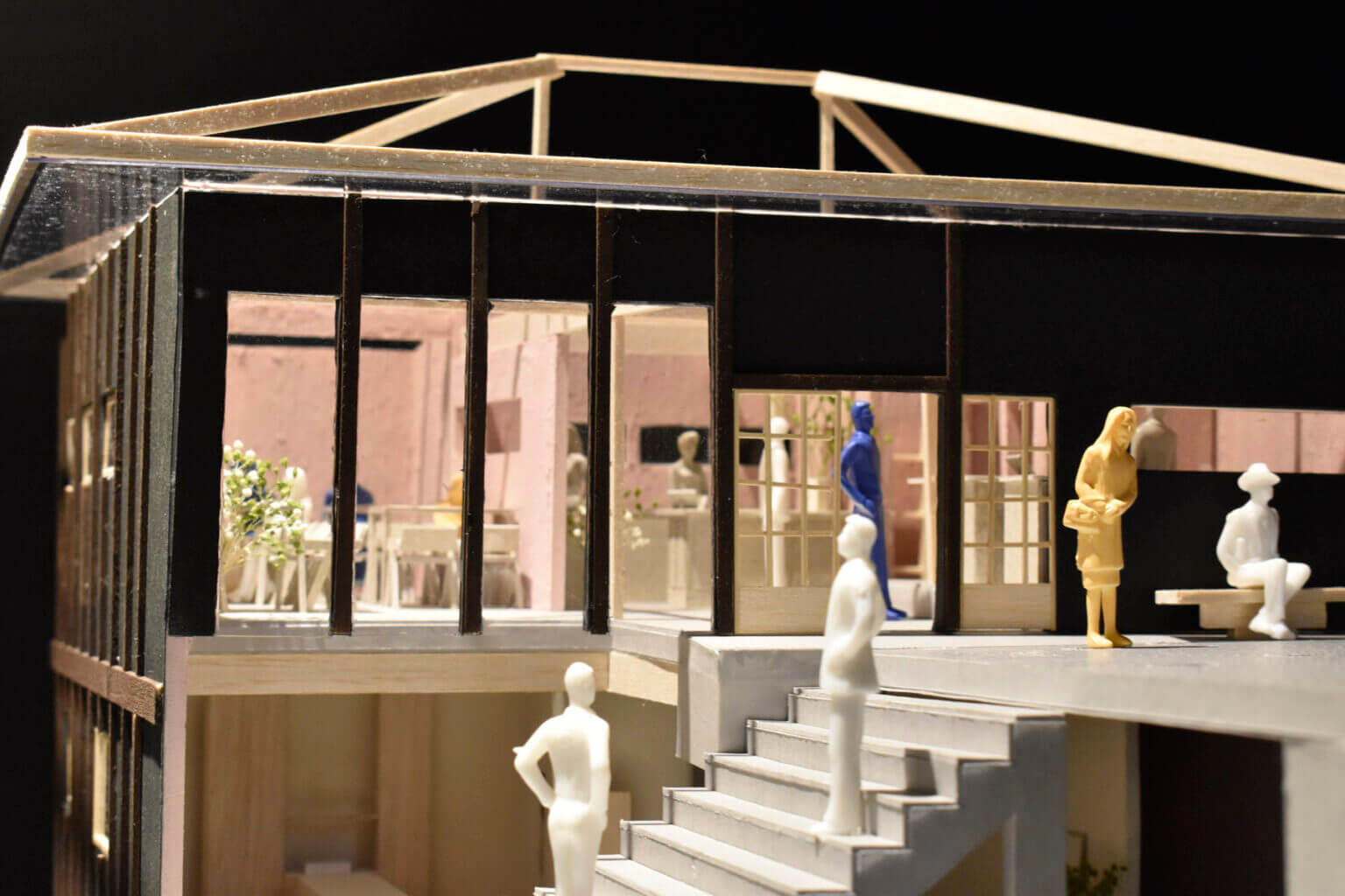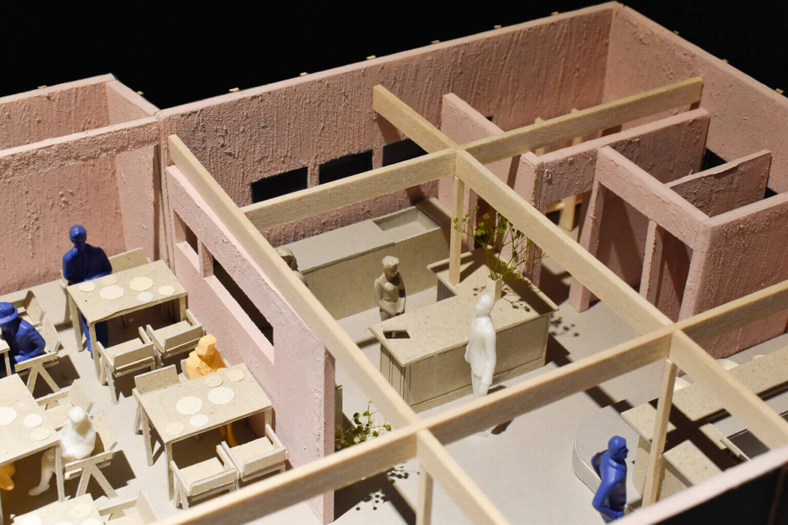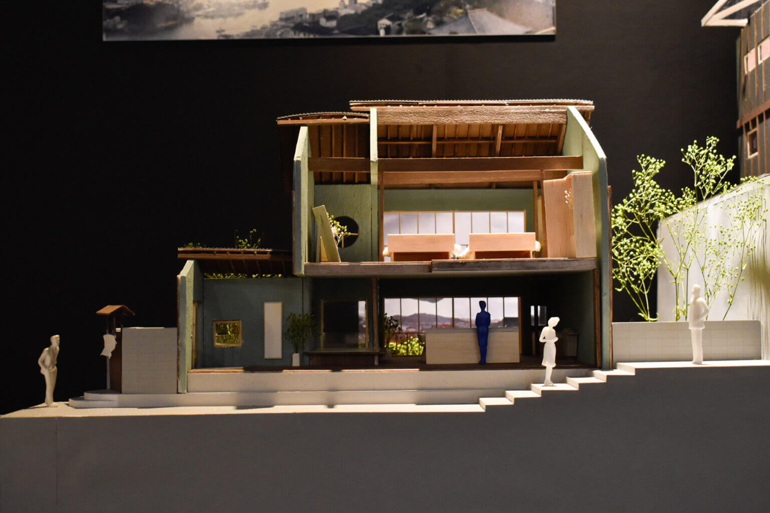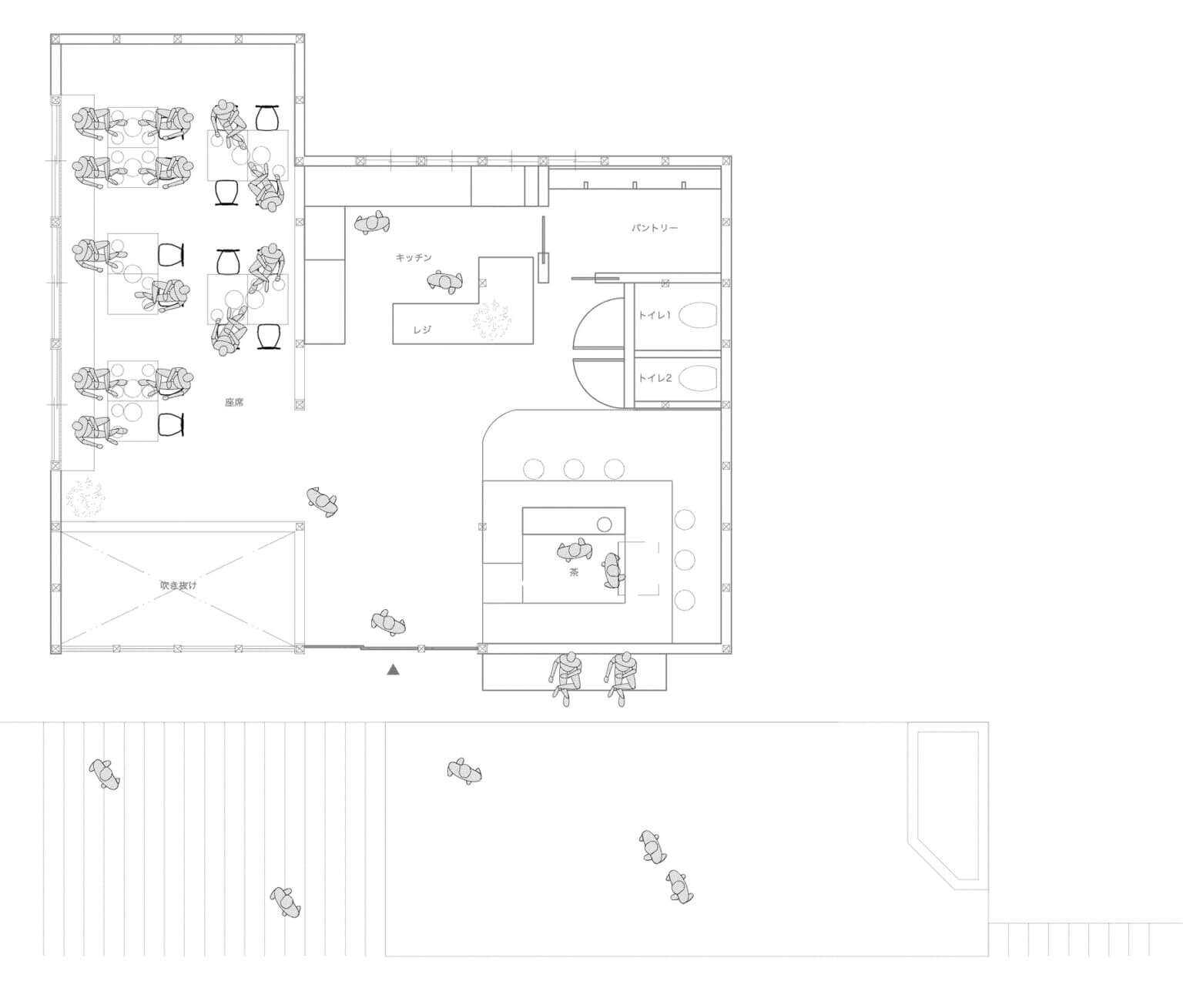 外ベンチを置いている壁面にはカフェで働くスタッフの動きがスリットからみえる、入り口突き当たりには厨房にいるスタッフやお客さんの動き、階段壁面をガラスに変更し店内を見せる。階段、広場にいる人が店内にいる人の様子を見て興味を引く様なレイアウトを目指した。右手カフェでは茶を淹れるスタッフの所作を外を歩く人の行き来を見て過ごす。食を楽しむ客席では季節とその土地の食材を身体に取り入れ、外から見える瀬戸内を眺めながら食を楽しむ空間になっている。