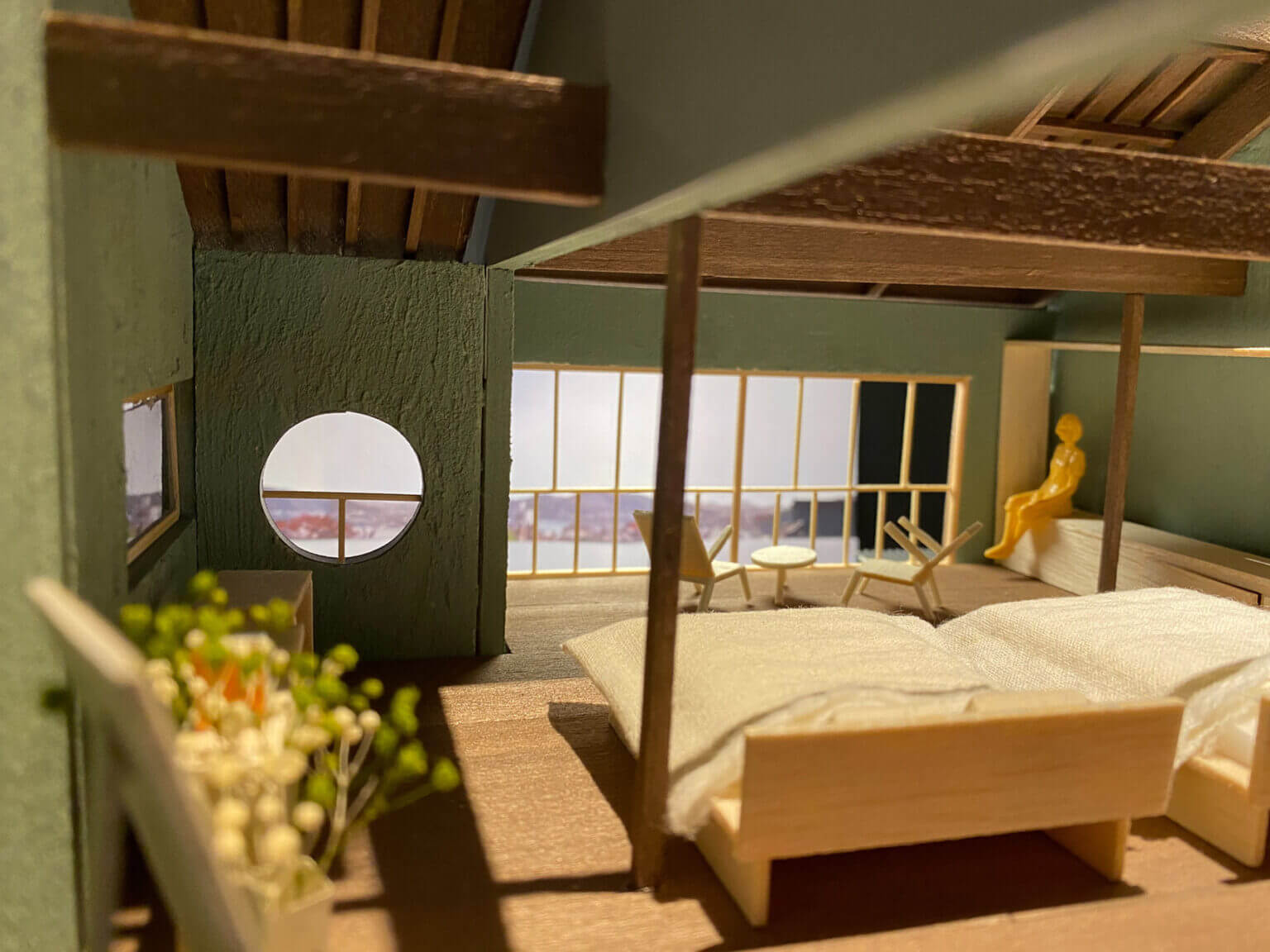「暮らすように泊まる」「建物の歴史を感じる」がテーマの宿。ゆったりとした落ち着きのある家具の配置から、この建物の見所である瀬戸内の景気を堪能できるレイアウトを計画。