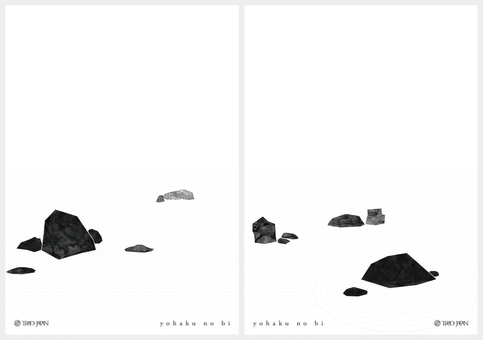 「新たな日本を再発見する」をテーマに、日本の美は余白の美というコンセプトで制作。無の中に有を見出し、幽玄を感じる日本的美意識こそが余白の美であり、体現する文化として枯山水をモチーフにした。パッと見では気付かないが、よく見ると確かに存在する砂敷を紙と同色で印刷し、余白による想像の余地を表現した。