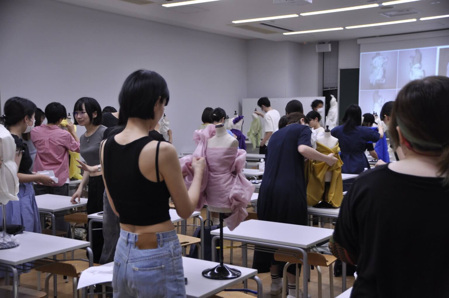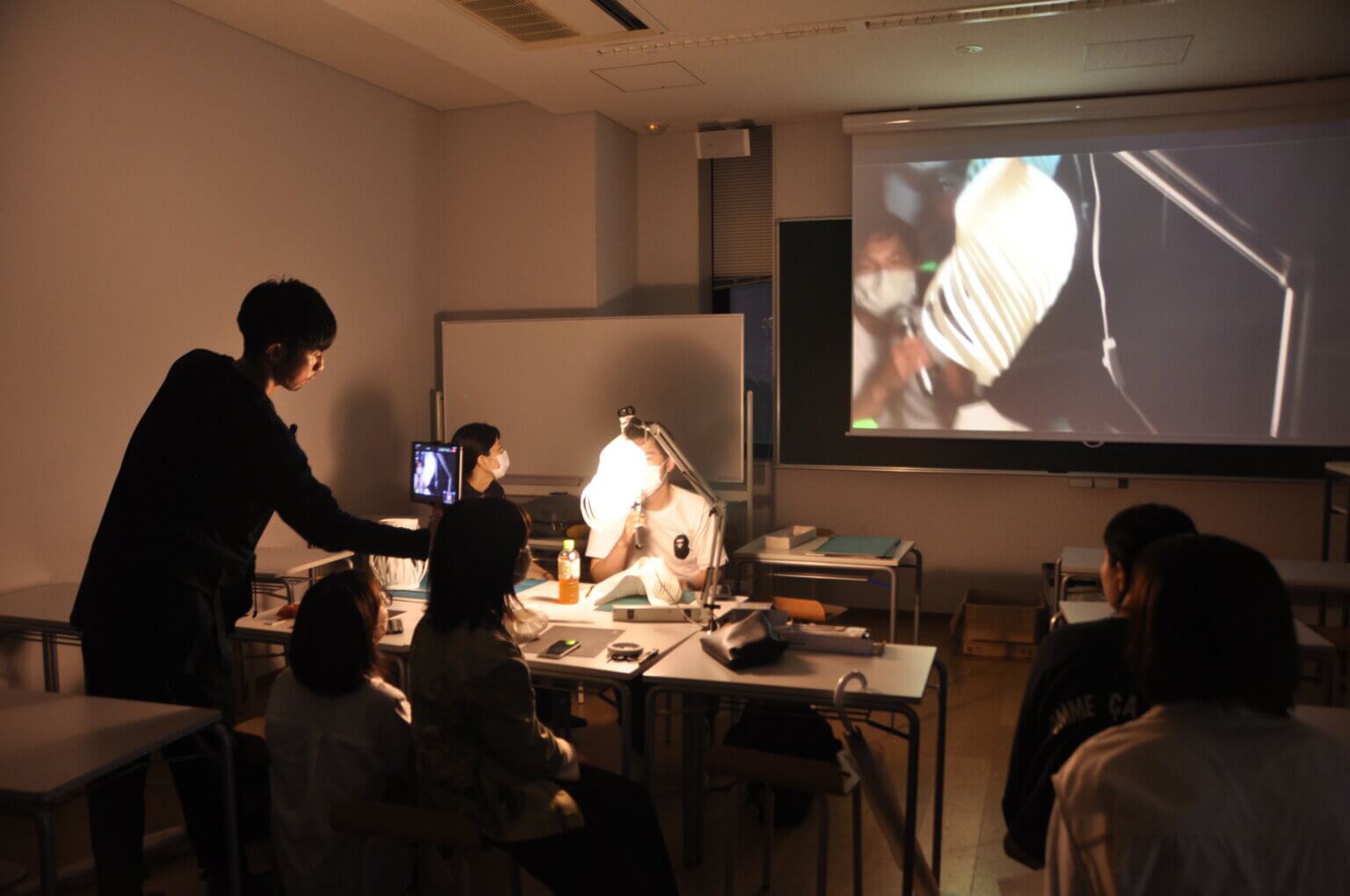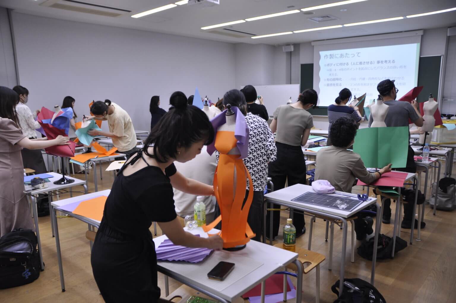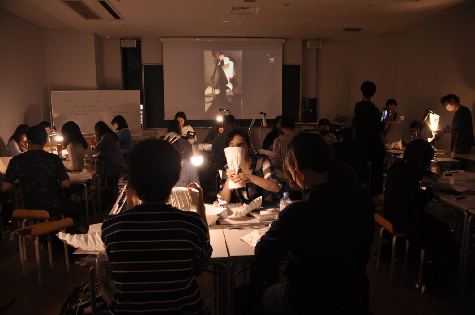 スペースデザインとファッションデザインの基本的なプロセスを体験します。即興的なプロトタイピング(試作・試用)を通じて、紙や布を加工し、身体や光をつつむことで、ドレス・照明・空間が生まれる瞬間に立ち会います。