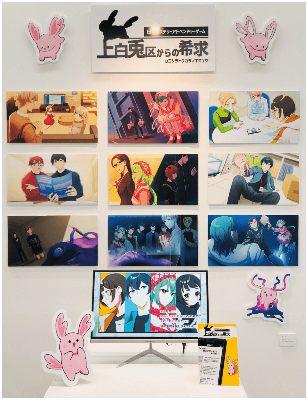 東京にある上白兎区(かみしらとく)という架空の都市を舞台にした、PCで遊べるアドベンチャーゲームという想定で九枚のスチルイラストと紹介ムービーを制作しました。
