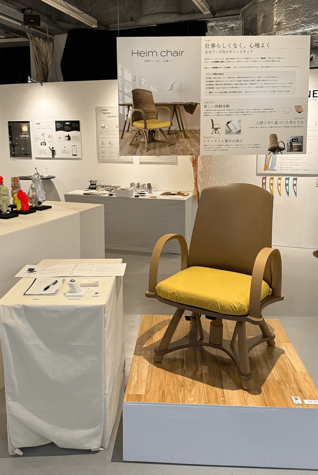 このデザインを実際に制作し、展示することで、形状や機能が空間に与える影響を検証しました。併せて、ボールキャスターの構造を示すモックアップを設置し、その仕組みを視覚的に伝えました。仕事と生活の境界が曖昧になりつつある現代において、この椅子が新しいワークスタイルを提案する一助となることを期待しています。