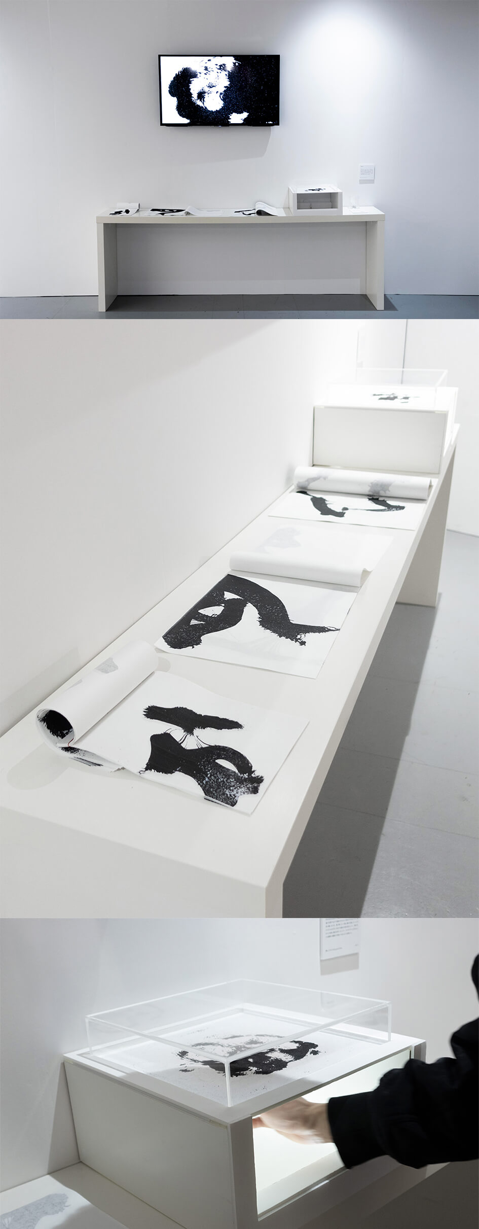 「書とタイポグラフィ」というテーマから、本作は文字という形が生まれる前の「運動」に焦点を当てた。書の美しさは、墨が定着するまでの動きそのものに宿るのではないか。通常の書における、動く筆によって紙に墨が定着していくプロセスからは文字に内在する動きが読み取りにくい。筆の代わりに砂鉄と磁石を用いることで、タイポグラフィが立ち上がる瞬間の運動を可視化できるように表現した。
