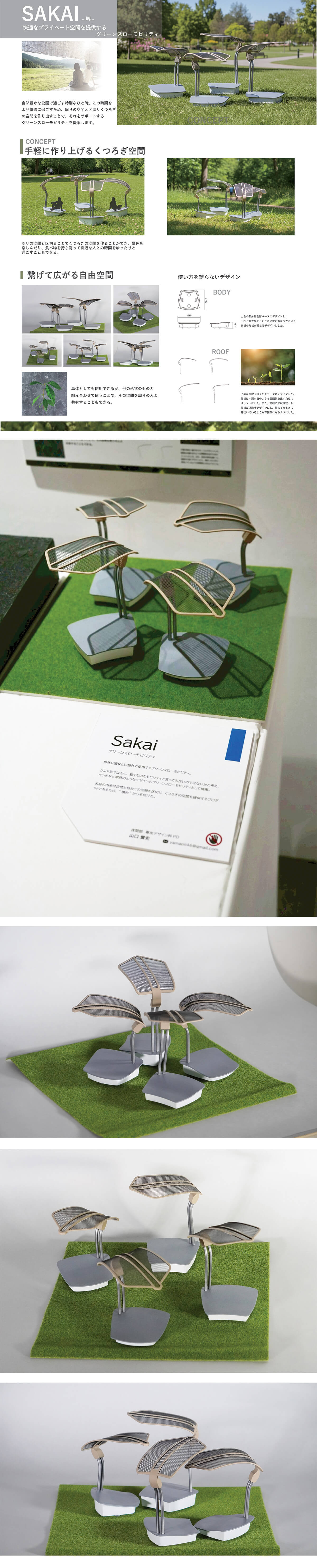 デザインは植物の芽が芽吹く様子をモチーフにしました。このプロダクトは単体でも使用できますが、複数体集まることでさらに使い方が広がるよう、車体と屋根をつなぐポールの形状は全て同じにしています。具体的には屋根の他に車体天板の形状と傾斜の具合を変えることで集まって初めて変化がわかるようにデザインしました。