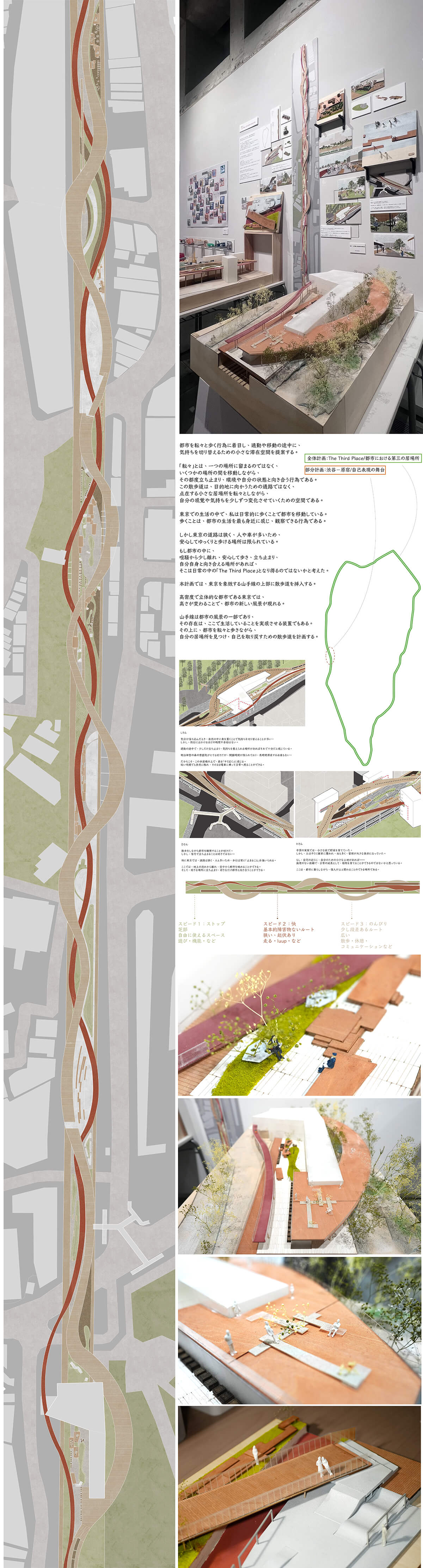 本計画では、東京を象徴する山手線の上部に散歩道を挿入する。高密度で立体的な都市である東京では、高さが変わることで新しい都市の風景が現れる。その上を転々と歩くことで、都市の中にいながら日常から少し離れ、自分の居場所を見つけていく散歩道を計画する。