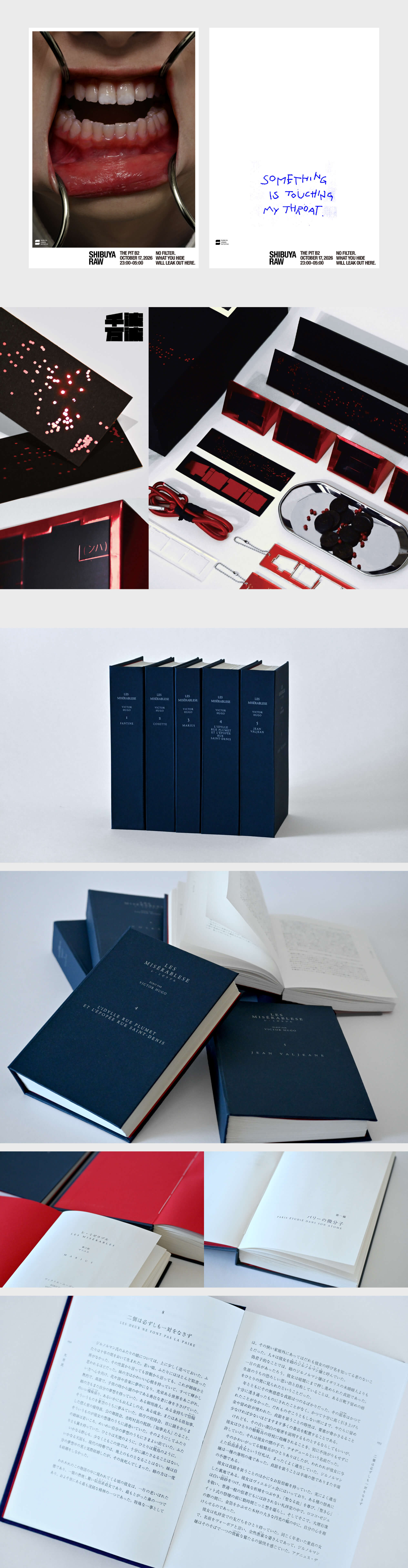 『レ・ミゼラブル』(ヴィクトル・ユーゴー著 / 1862年刊)を題材に、日本語訳を横組みで再構築。洋書の形式を踏襲することで、翻訳でありながら原典の空気に近づくことを試みた。クラシックな設計を土台に、「簡潔で上品」を指針として構成。判型はOxford World’s Classics(128×196mm)を採用し、マージンはヴァン・デ・グラーフ・カノンに基づき設計した。印刷は専門の印刷会社に依頼し、製本は糸かがり綴じによる上製本として自ら行った。表紙は突きつけ仕立てにすることで、歴史性を残しながらも過度な装飾を排し、現代的なフラットさを目指した。