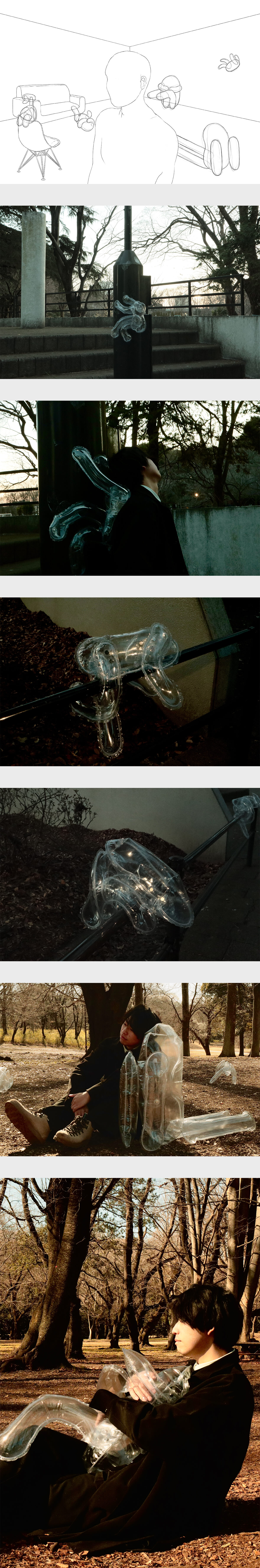 本作品は、空間の様々なものに対して子どものように無邪気に、そして自由に遊ぶように身体を預ける実験から始まった。『Larutan』も同様に、壁や床、椅子の背もたれ、肘掛け、浴槽の縁(へり)など、様々な場所に身を預ける。そして使用者は『Larutan』へ寄りかかったり、抱きしめたりしながら、自由に関わることができる。