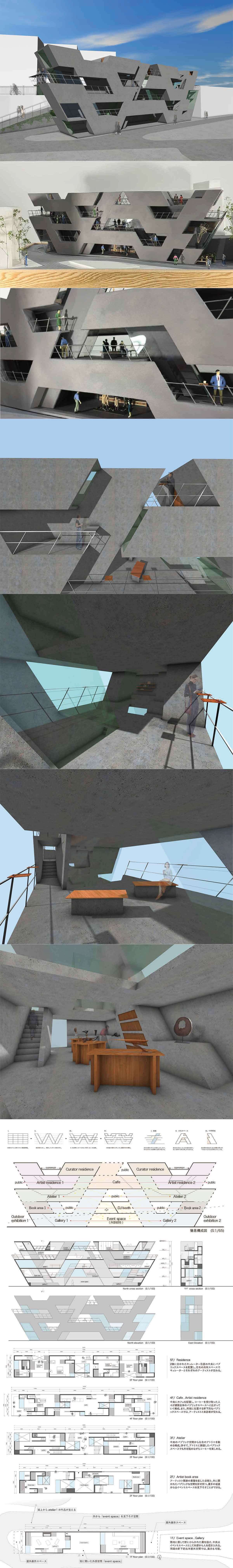 個人の表現や小さな活動が点在するクリエイティブな街並みと、かつて茶を媒介とした対話の文化が育まれてきたこの街の性質を背景に、本計画では、アーティスト・イン・レジデンスと、誰もが立ち寄れるカフェを建築の核とする。垂直と水平によって分節されがちな現代建築の構成を問い直し、建築全体を60°の斜め壁と斜めに貫入するガラス筒で構成することで、上下・左右に加え斜め方向にも視線と気配が行き交う空間をつくり出す。 角度の操作によって、居住者と来訪者、街と建築の関係性を再編し、外部の気配や対話が制作へと作用し、表現と交流を編み直す建築を提案する。