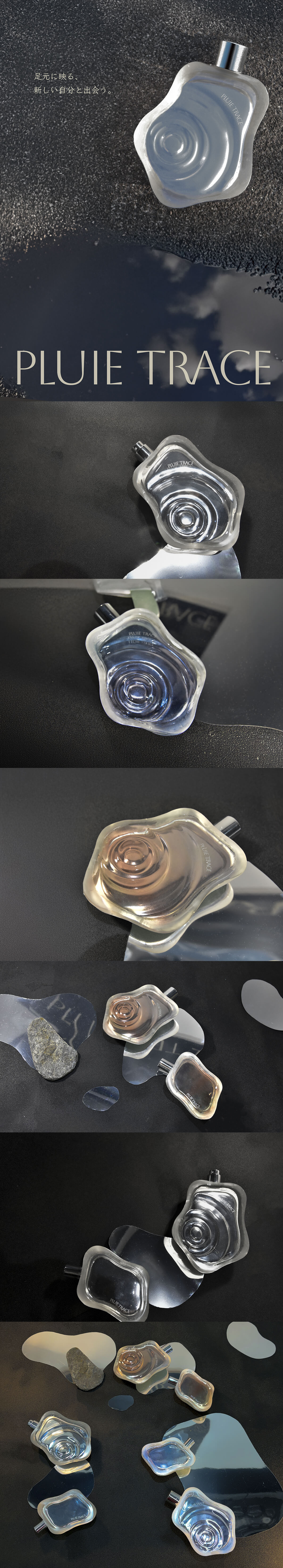 水たまりを「雨が通り過ぎた痕跡=足跡」と捉えました。水たまりは時間とともに消えていきますが、そこに生まれた情景や感情の記録は残り続けます。香りもまた、形としては残らない一方で、記憶や感覚を呼び起こす媒体です。