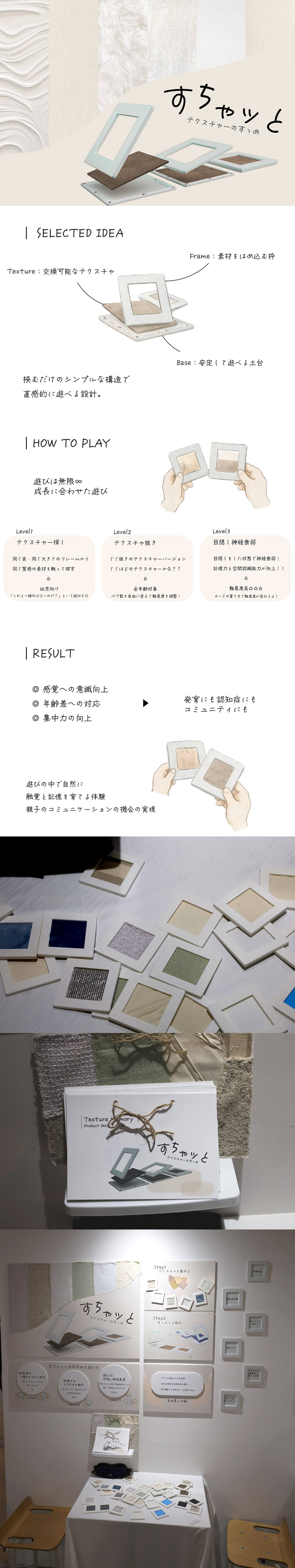 視覚だけに頼らず素材の質感に触れる体験から記憶を育てるテクスチャメモリートイ。指先の感覚を鍛えて成長期の脳の発達や認知症対策など。トランプのように柔軟な遊び方ができるプロダクト。
