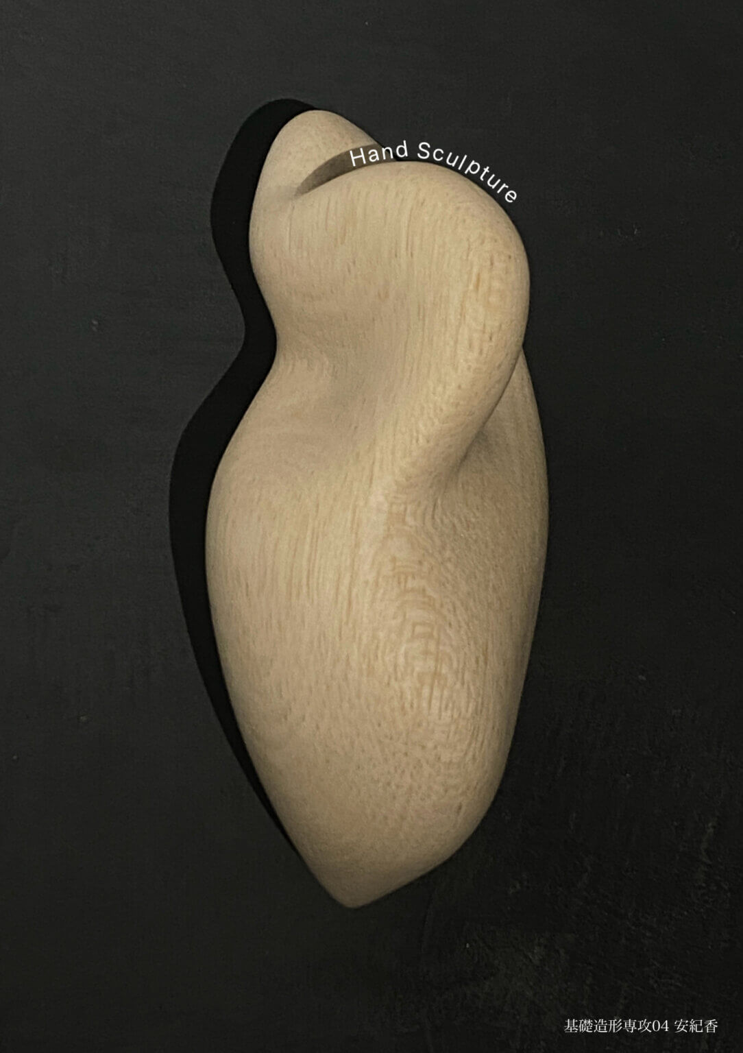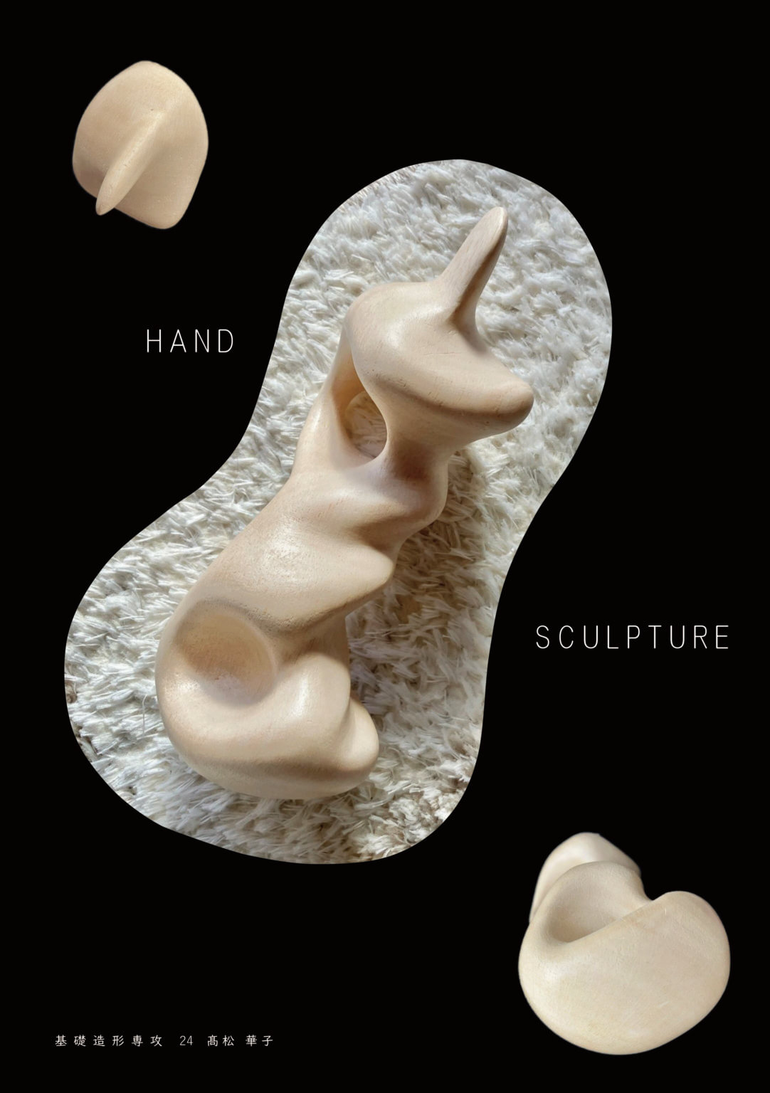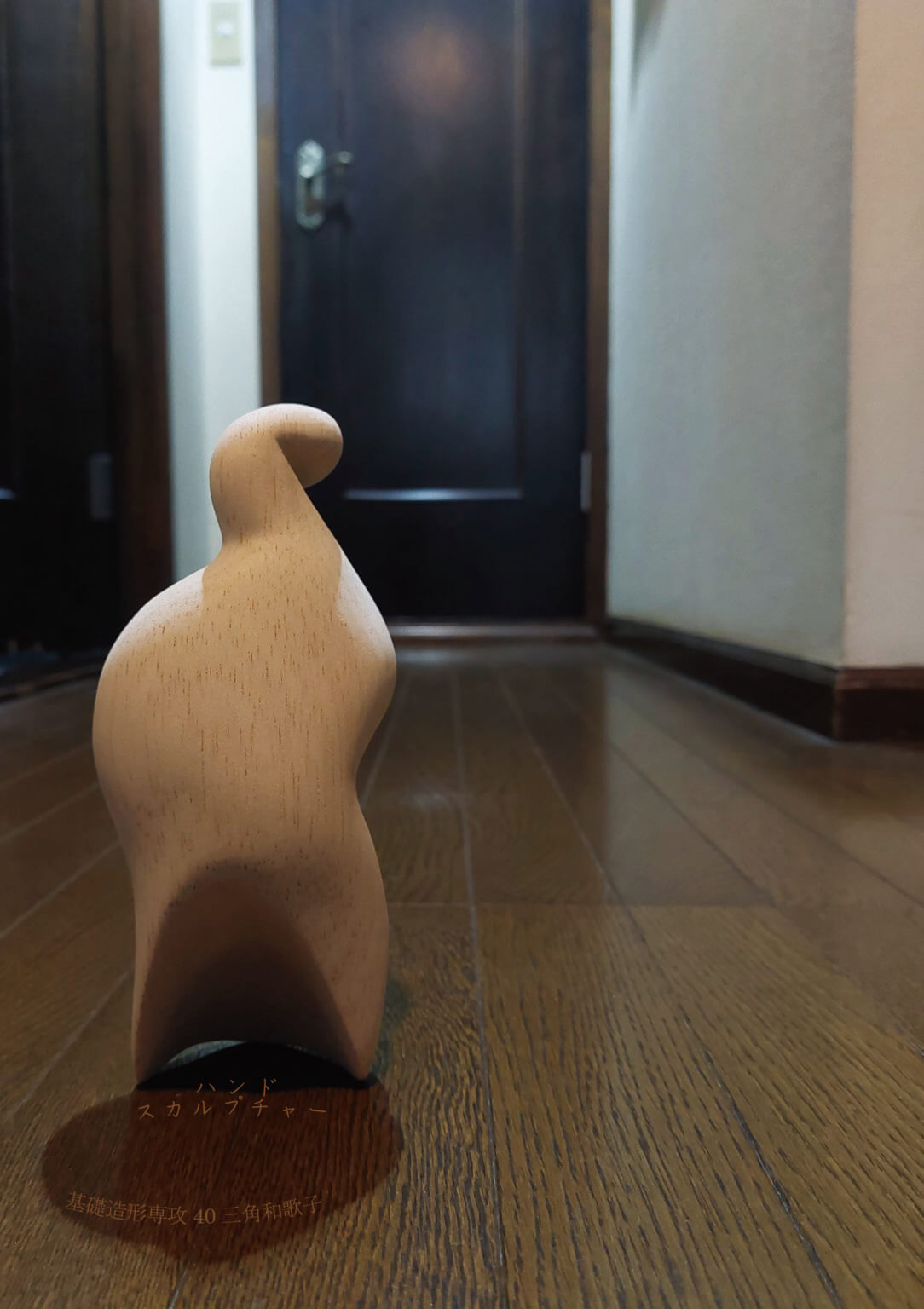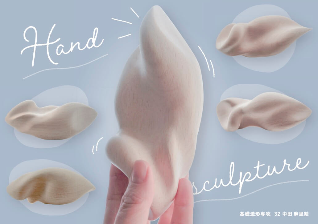 木材をのこぎりやナイフを使って〈手に調和する形〉に削ります。視覚的な美しさではなく、触覚を判断基準とすることで、予想外の造形が生み出されます。〈発見〉や〈ひらめき〉をうながす課題のひとつです。