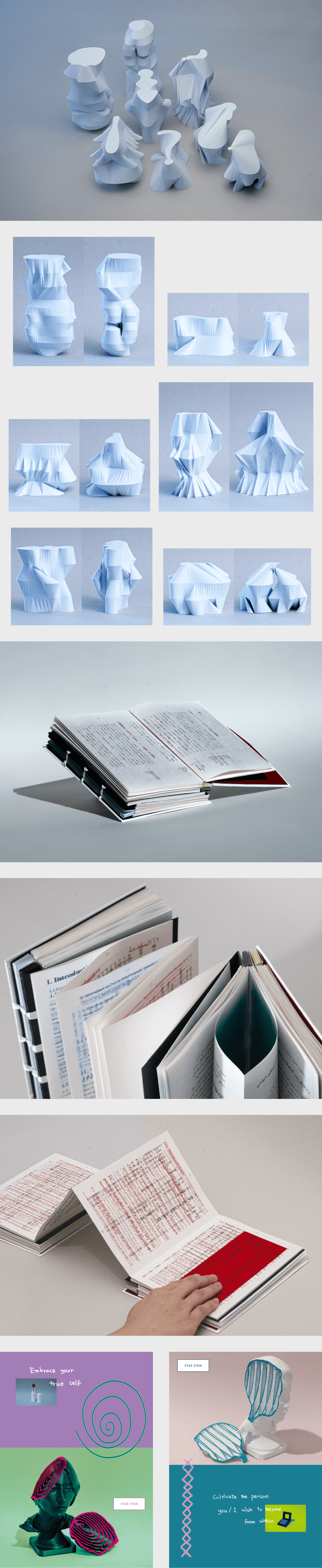 内容が日本特有の文化に焦点を当てているため、あらゆる言語の人に伝わるよう4カ国語で構成、両開きで製本した。同時に、中央部分を蛇腹で実装。カラーフィルムを重ねることで色眼鏡を外す暗喩をした。また、袋とじの内側に各国の国旗の含まれる色を印刷したのは、常識の相違が国ごとに存在するメタファーである。表紙は白で統一し、理想的な、真っさらな視点を表現している。