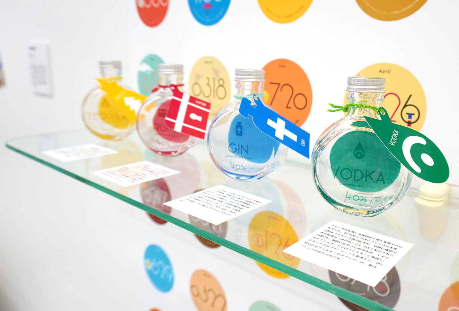 カクテルカレンダーはカクテルを盛り上げる一部に過ぎなく、よりカクテルに触れやすいようにカレンダーなどと連携して4大スピリッツの瓶のデザインもしました。だれにでも手に取りやすい形やわかりやすい図形で制作しました。瓶正面のアイコンはそのスピリッツが作られたきっかけや呼び名を元に制作しました。