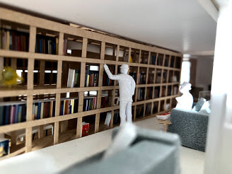 本の発行部数は年々落ち込み電子書籍で本を読む人が多くなった世の中で、私はあえて紙の本を収納した「ブックカフェ併用住宅」を設計したいと考えた。指導の講師からは「例年本棚を選んだ生徒は発表までに終わらないぞ」そんな言葉に恐怖を覚えながらも、作りづらい格子の本棚を23個やり遂げられたのは、シンプルに私自身が本が大好きで、今後どんなに文明化された世の中になっても紙の本は無くなって欲しくないと思うからだ。紙をめくる行為や、装丁された本の質感はデジタルでは味わうことのできない心の動きや感動がある。