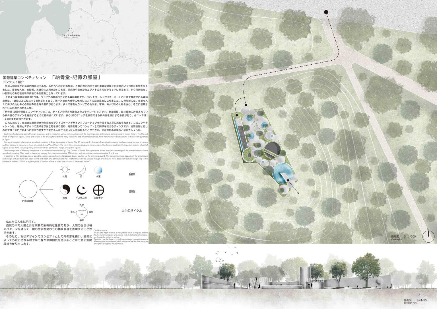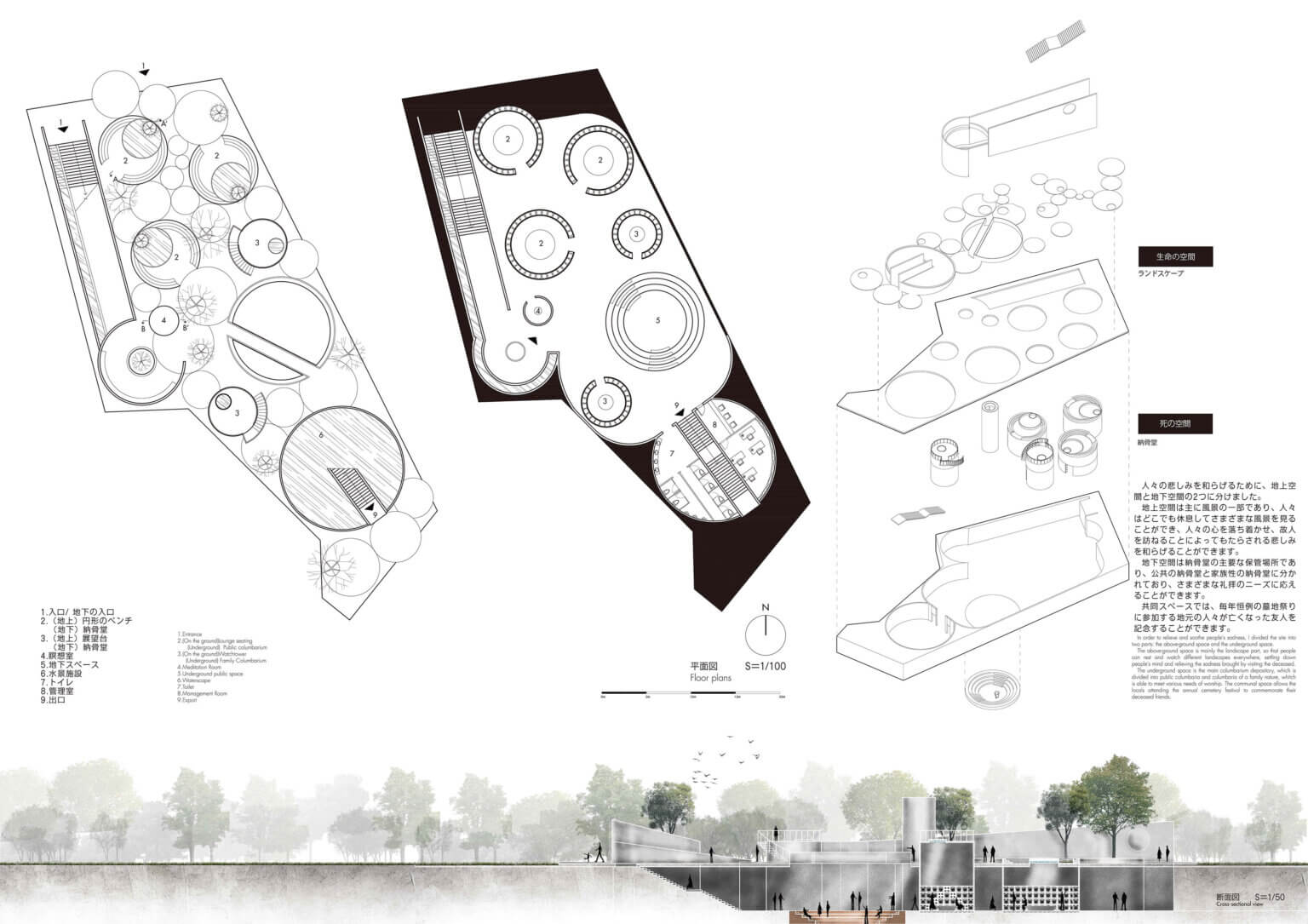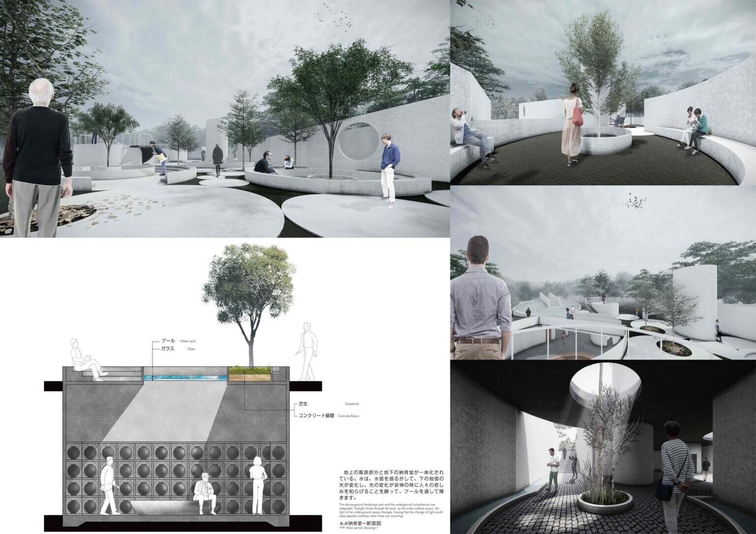 自分の卒業制作は国際的な建築コンペの提案です、自分の「死生観」を考えて、様々な空間体験、ランドスケープなどを作りました。愛する人が亡くなった人を訪ねることができる、立派な慰めの場所をデザインしました。