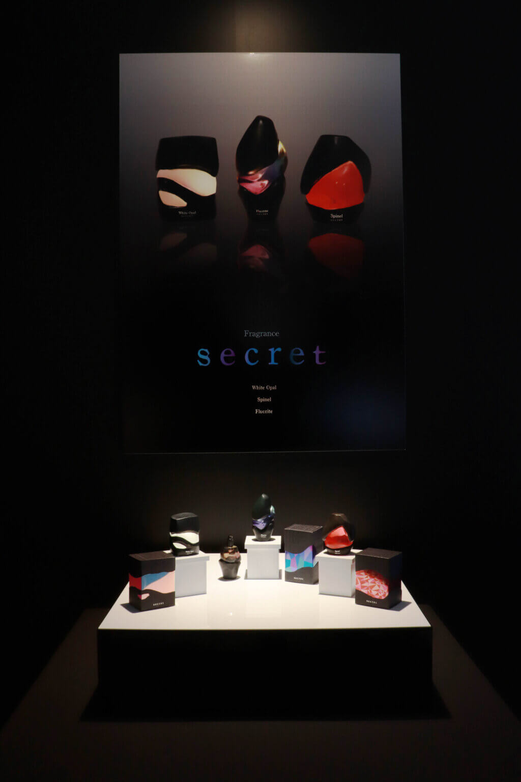 黒い岩間から鮮やかな宝石がのぞいている様子を表現しました。オブジェとしての存在感も意識し、幻想的な雰囲気をベースに制作しました。それぞれの宝石が持つ色や石言葉をイメージした香りのフレグランスを想定しています。
