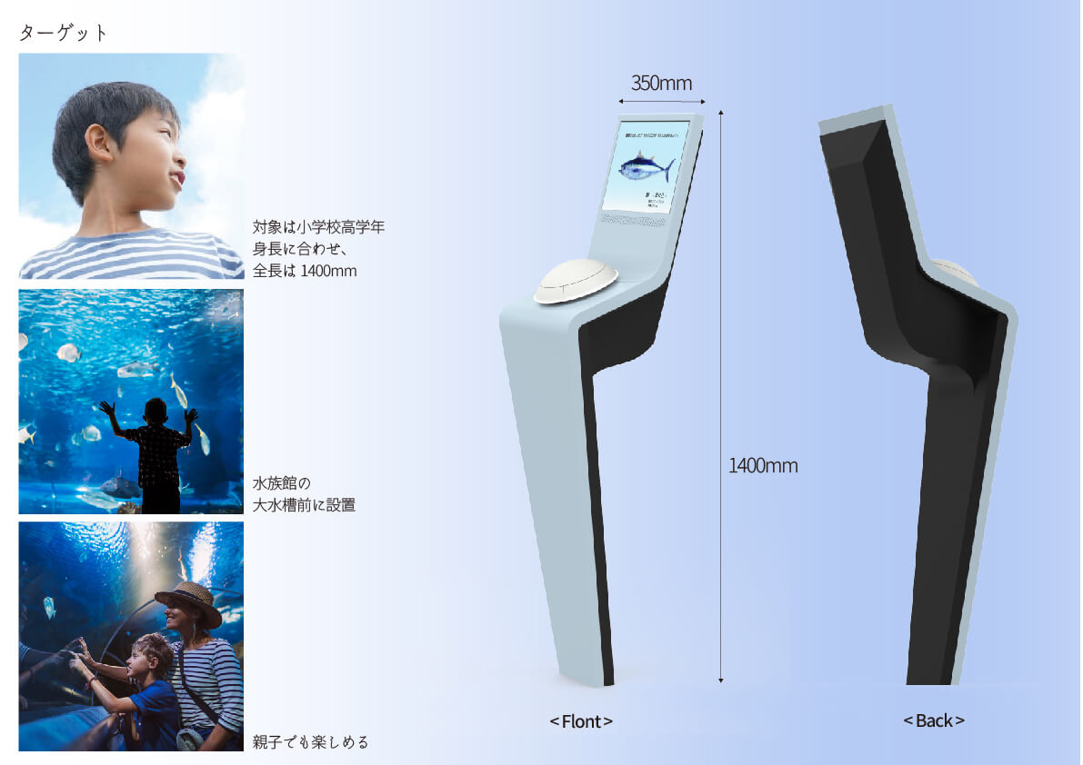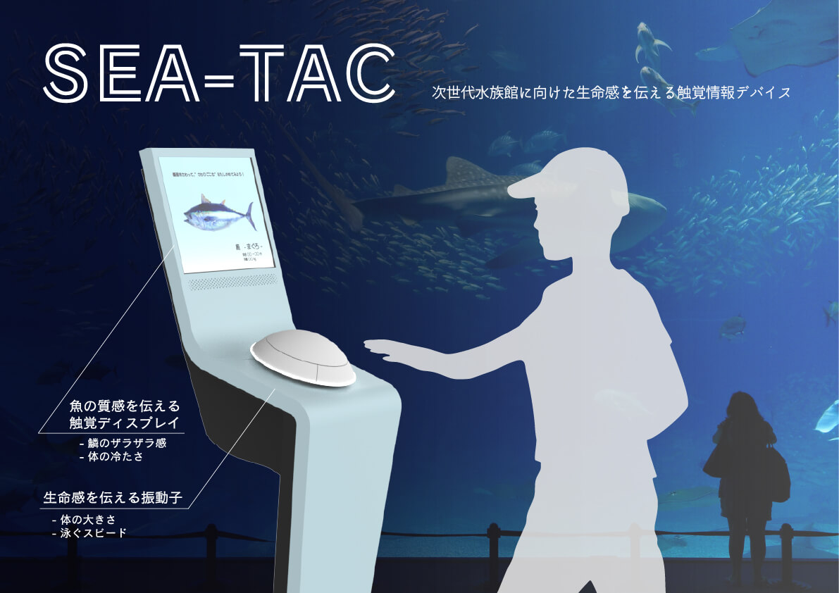 次世代の水族館に向けた情報デバイスの提案。触覚通信技術により、普段触ることの難しい海の生き物の生命感を体感、学習できる。