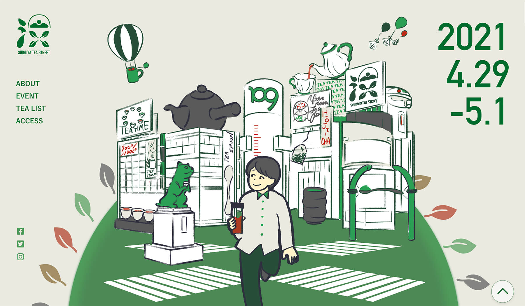 私のおうち時間を豊かにしてくれたのは、お茶を飲む時間。そんなお茶の魅力を伝えたいと、このイベントを企画した。トップページには、渋谷の象徴的な街並みとお茶の要素を掛け合わせた楽しげなビジュアルを据えた。ところどころにもイラストを使用し、温かみのある雰囲気を心がけた。また、イベントロゴやグッズなども考案した。