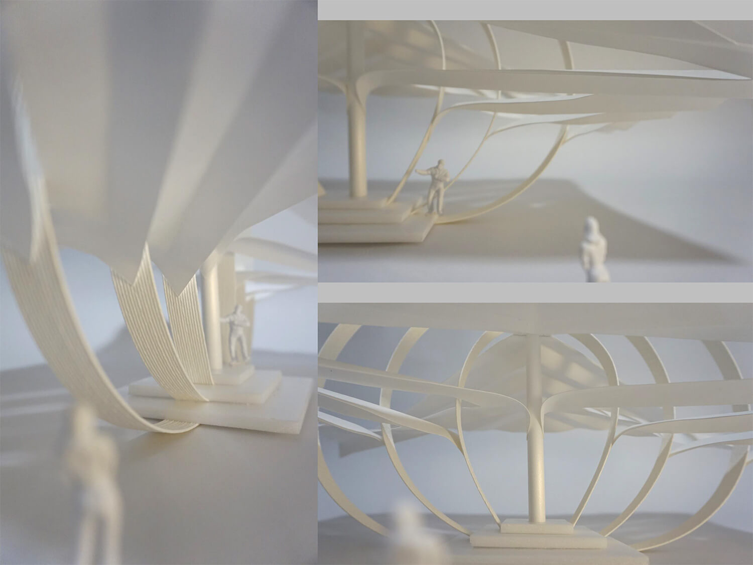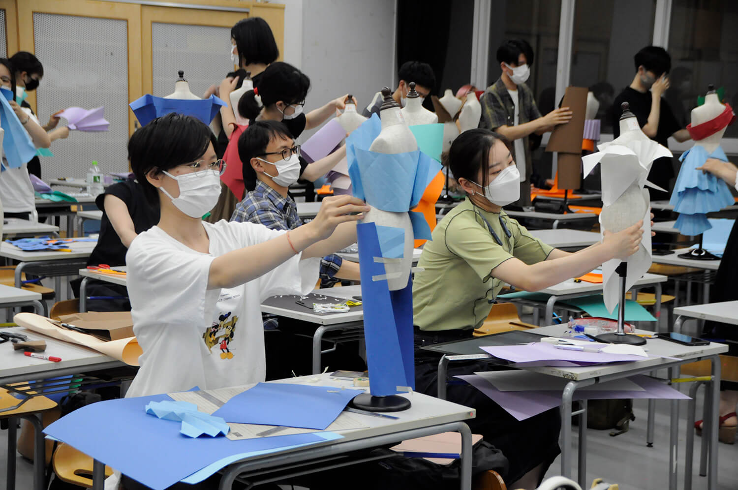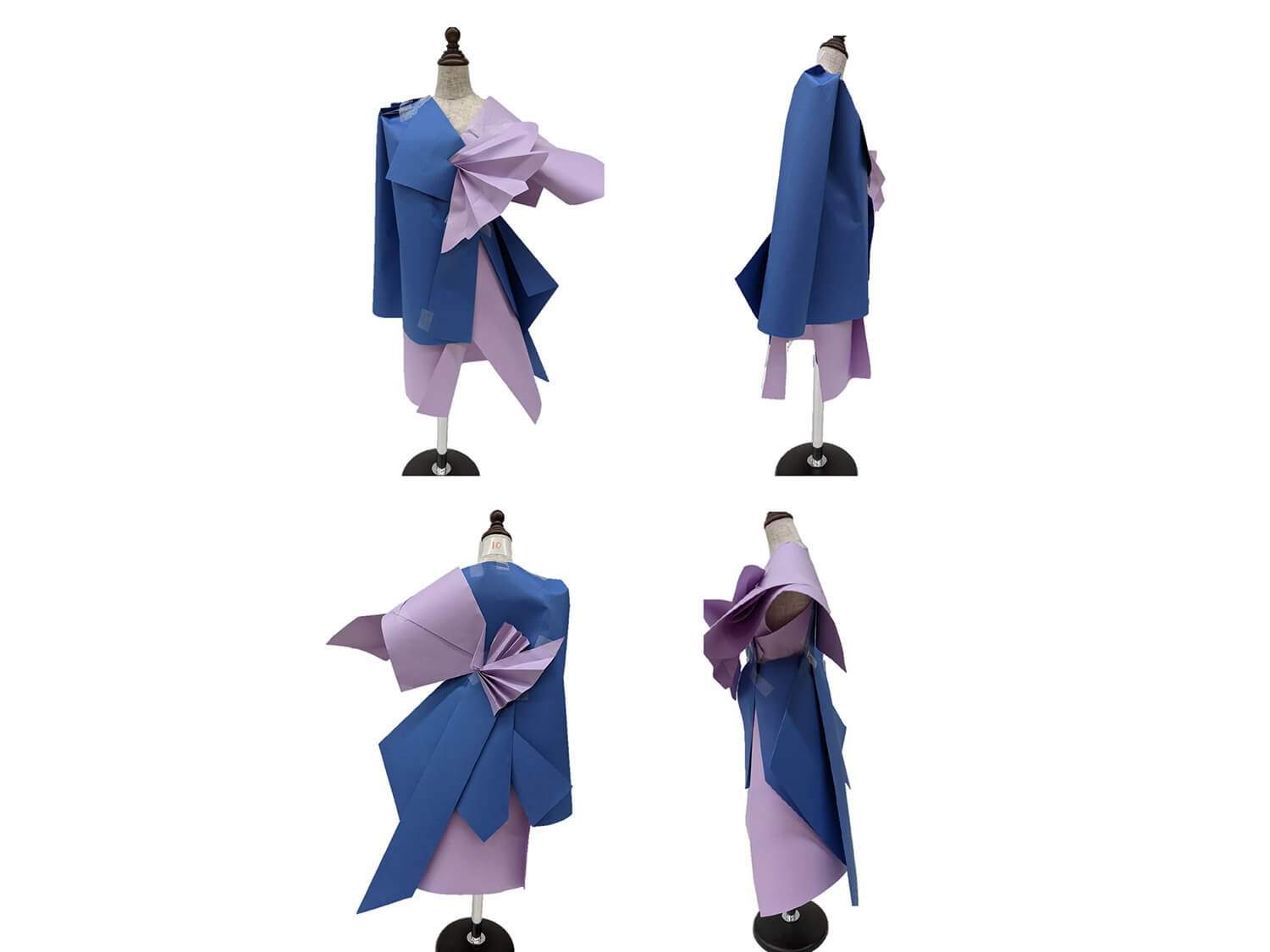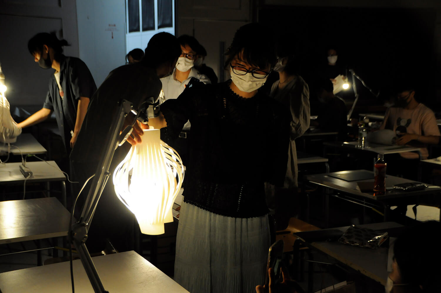 スペースデザインとファッションデザインの基本的なプロセスを体験します。即興的なプロトタイピング(試作・試用)を通じて、紙や布を加工し、身体や光をつつむことで、ドレス・照明・空間が生まれる瞬間に立ち会います。