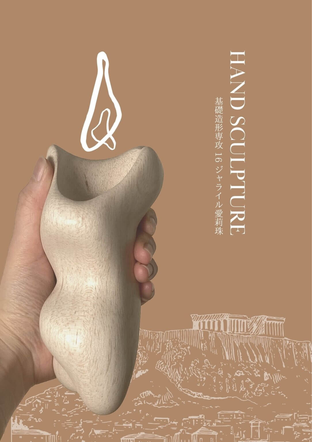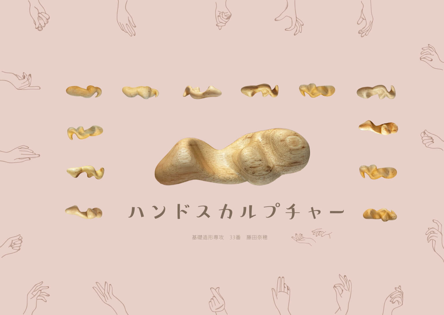 木材をのこぎりやナイフを使って〈手に調和する形〉に削ります。視覚的な美しさではなく、触覚を判断基準とすることで、予想外の造形が生み出されます。〈発見〉や〈ひらめき〉をうながす課題のひとつです。