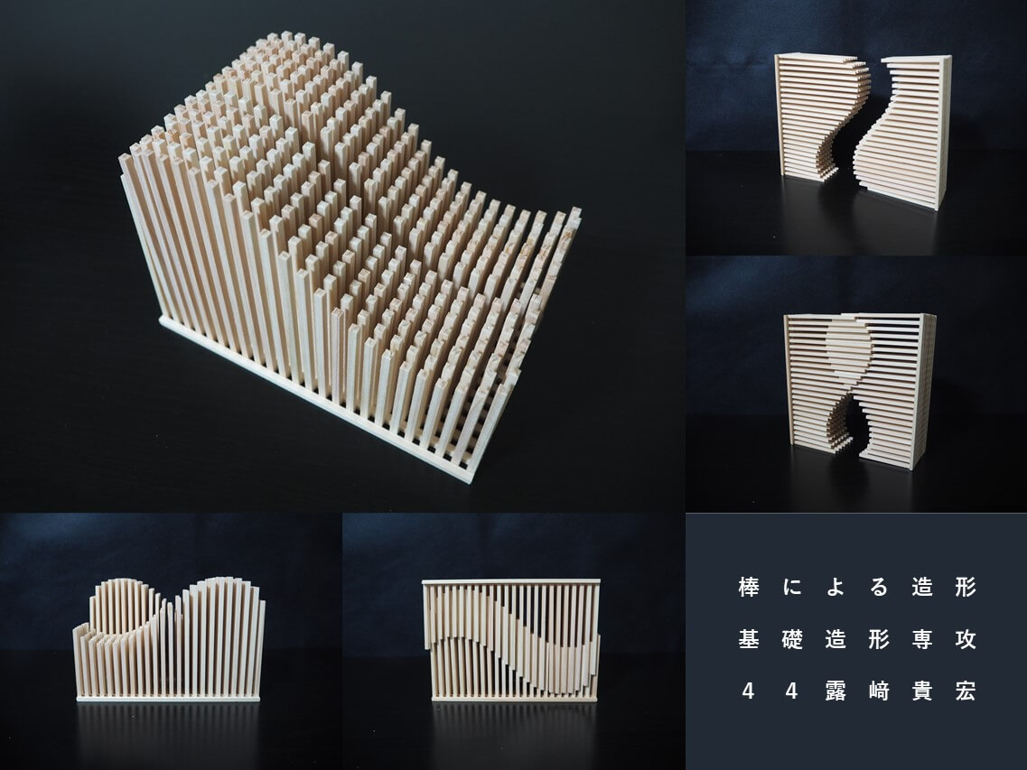線材の特徴は〈長さ〉と〈方向性〉です。それを計画的に連続・集積させることで、生み出されるリズム感や動きなどの表現効果を学びます。形を〈体系的〉に理解して〈計画的〉に操作する「構成力」を養います。